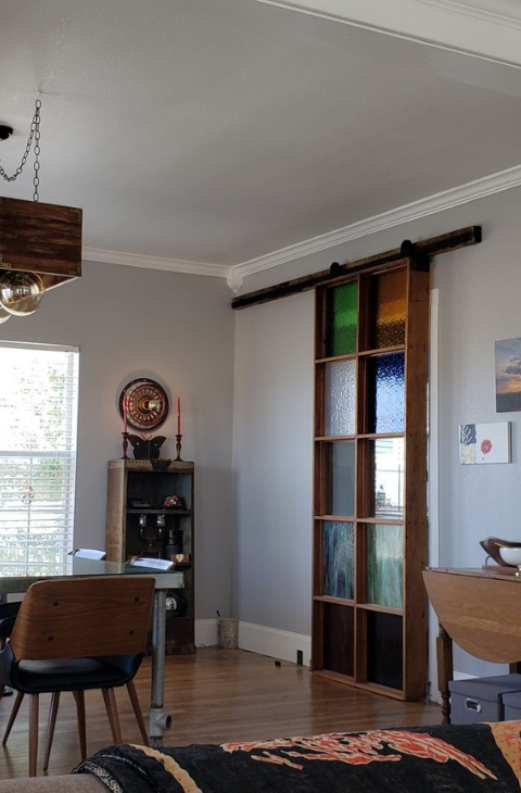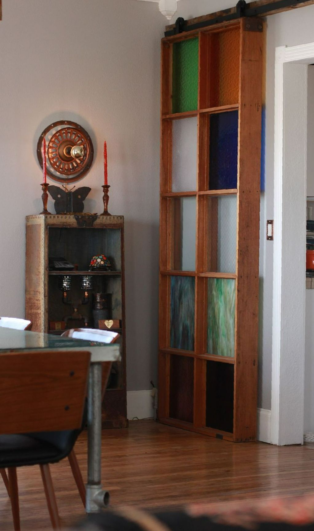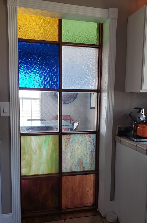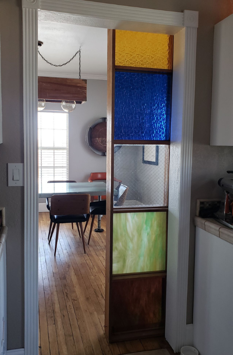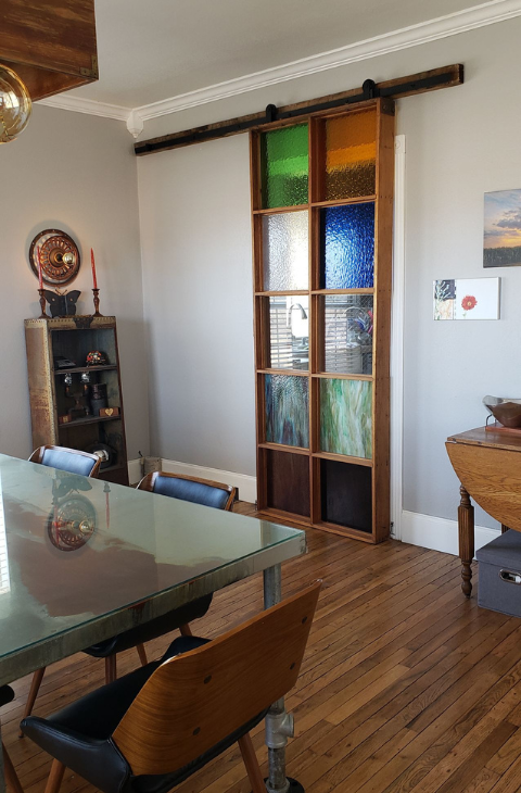 This Old vintage, church glass antique, was transformed into awe-inspiring artistry turning the heads of onlookers and eliciting inspiring conversations. Designed with timeless sophistication, Each colorful vintage square glass tile is framed by solid oak, stained with hues of nut brown and finished with hand bent 14 guage steel bolted for long standing durability. Gliding strong from high quality engineered steel, the ash powder coated wheels securely roll the restored masterpiece from wall to enclosure surprisingly creating a solid sound barrier.