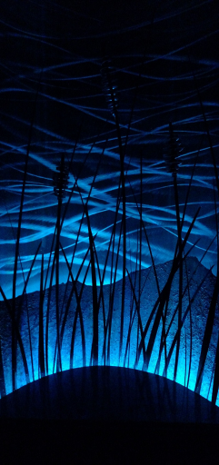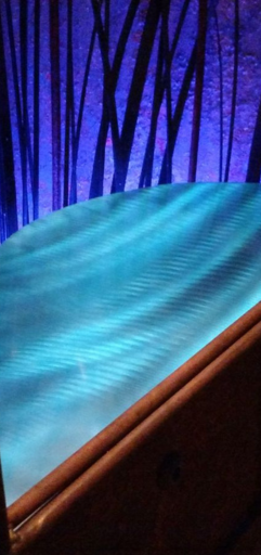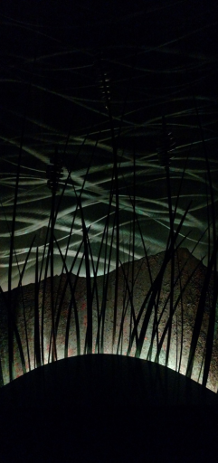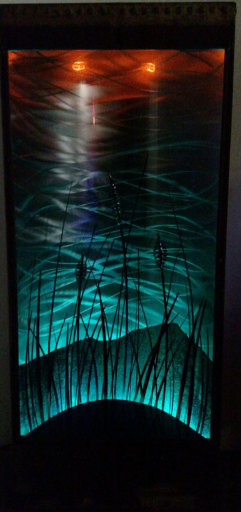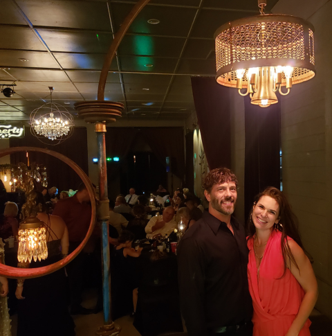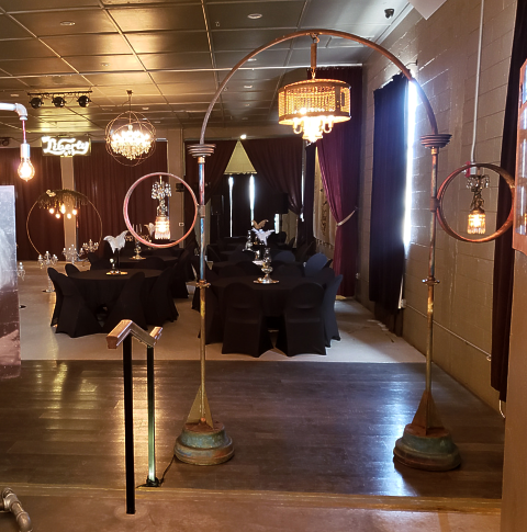 Merging iron and whimsical design the 20ft sculpture with galvanized 8inch pipe curved spherically forming a vaulted canopy holding a modern antique lit chandelier emitting a warm glow halo over the paradisaical atmosphere fitting for two adults underneath. A heavenly scene fused with twin ethereal angels lit on either side encased in their own recycled metal spheres, each with antique globes casting warm hues reflecting dazzling sparkles of light through the prisms dangling off the dancing cherubs.