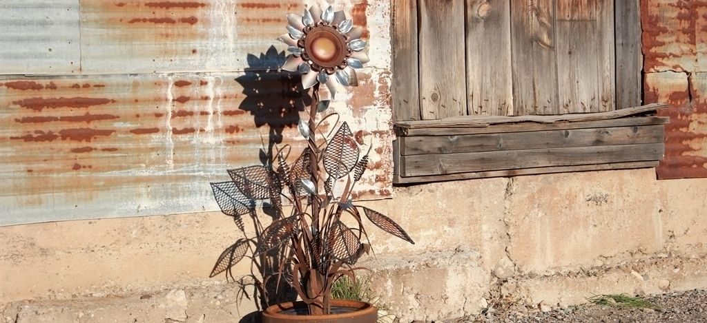 This outdoor metal yard art houses bold hand-cut leaves shooting from a simple terracotta Planter blending graceful rustic charm and simple natural elements with robust flair