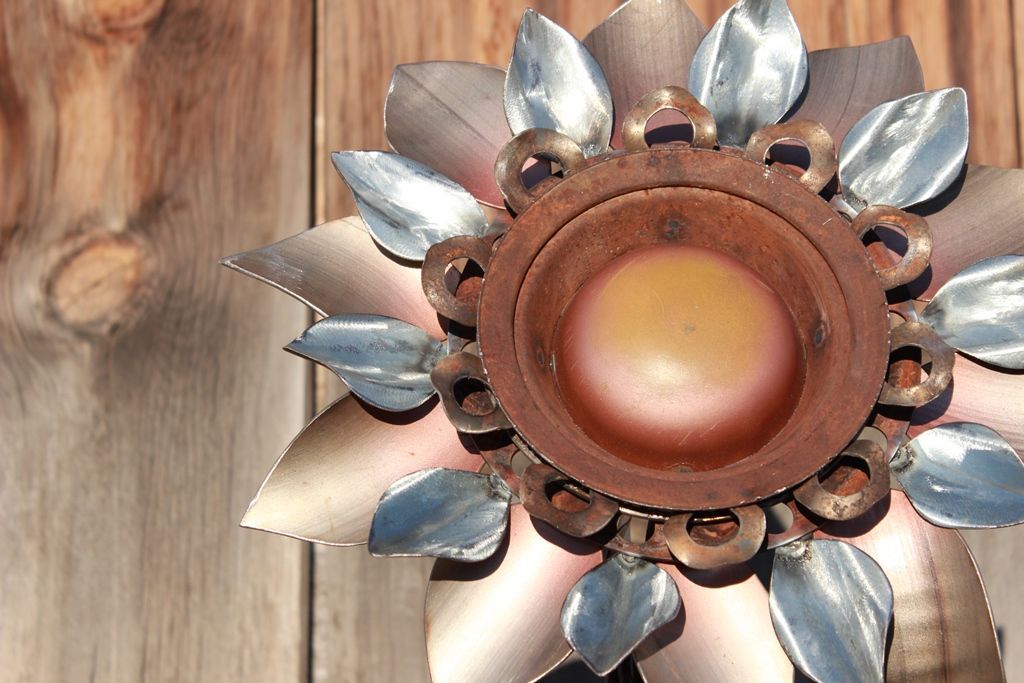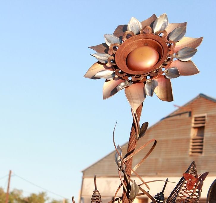 This outdoor metal yard art houses bold hand-cut leaves shooting from a simple terracotta Planter blending graceful rustic charm and simple natural elements with robust flair